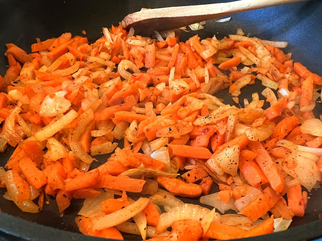 Pak een koekenpan waar de broodjes straks naast elkaar in kunnen. Doe daar een plens olie in en verhit dit. Bak de hutspotgroentes zachtjes een paar minuten in aan en strooi er de chili- en paprikapoeder overheen en schep al bakkend goed om.