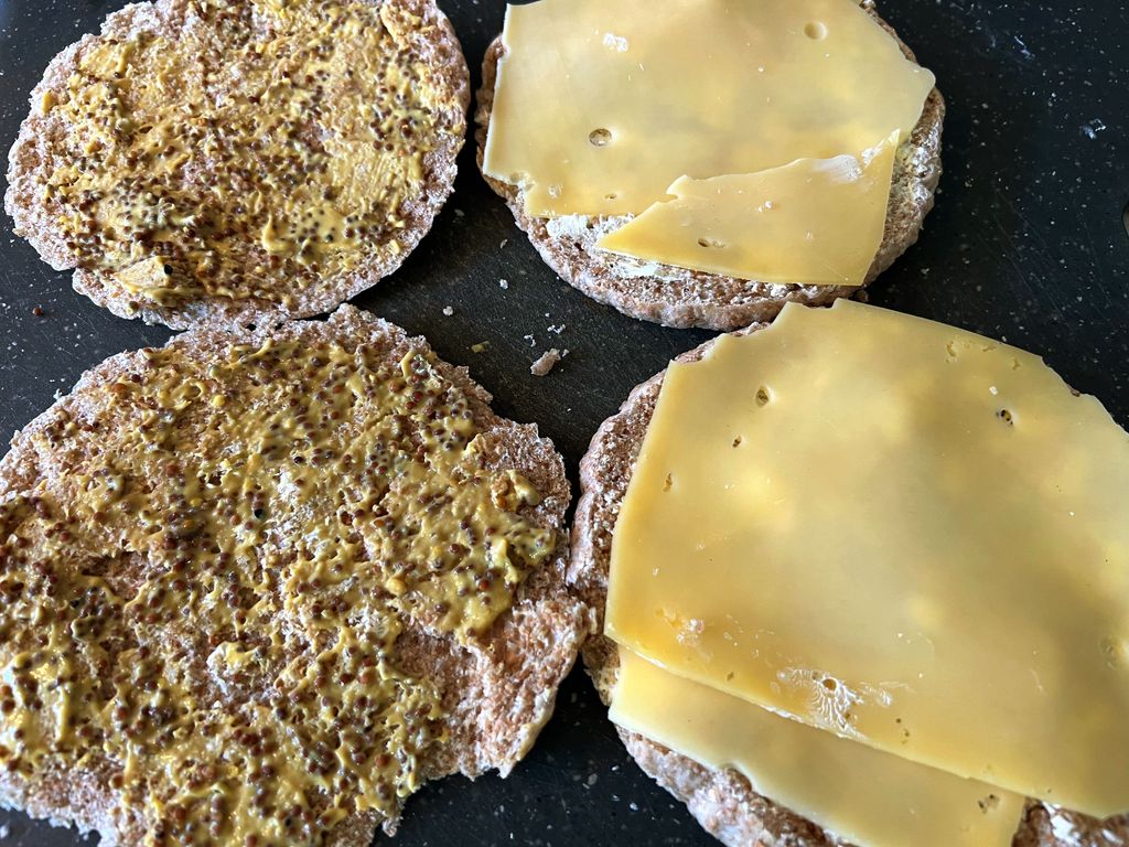 Snijd de pitabroodjes daarop voorzichtig open, kijk uit dat ze niet scheuren. Besmeer ze aan 1 kant dunnetjes met mosterd en aan de andere kant met halvarine of boter. Leg ze open neer. Op de kant met de boter leg je de plakjes kaas, de kaas mag niet te veel uitsteken, anders smelt ie straks het broodje uit.