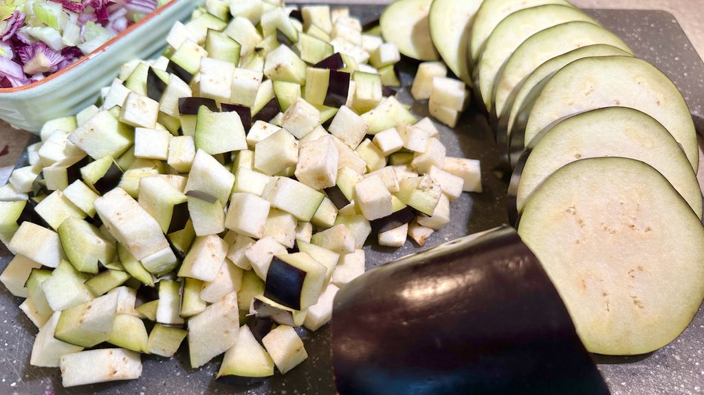 Snijd de kontjes en steelaanzet van de aubergines en snijd in niet te dikke plakken. Daarna snijd je de plakken in kleine blokjes.