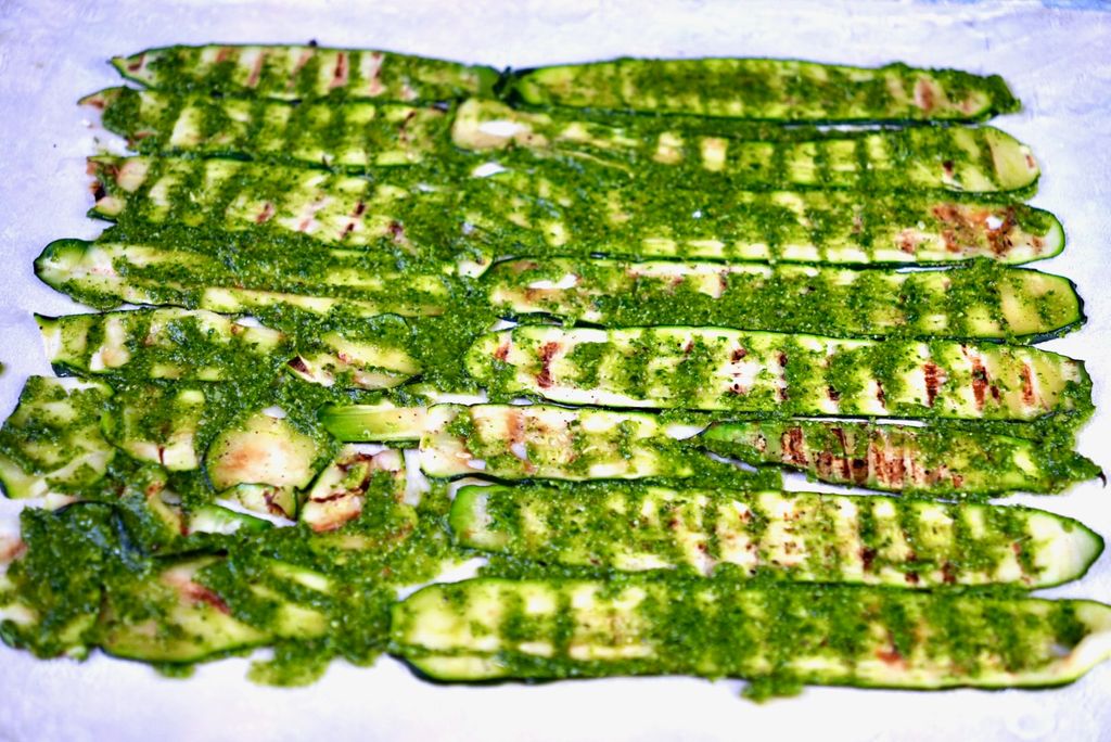 Besmeer de courgetteplakken met een laag pesto. Gebruik alle pesto.