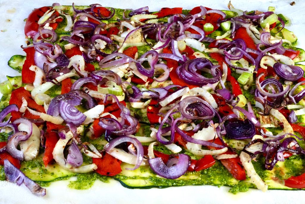 Rooster de courgette en venkel aan beide kanten in een grillpan mooi bruin. De ui en paprika kun je tegelijkertijd in een gewone koekenpan zachtjes aanbakken. De courgette bestrooi je na het grillen met peper en zout. Leg de plakken courgette, ui, paprika en venkel op een groot plat bord en laat afkoelen.
