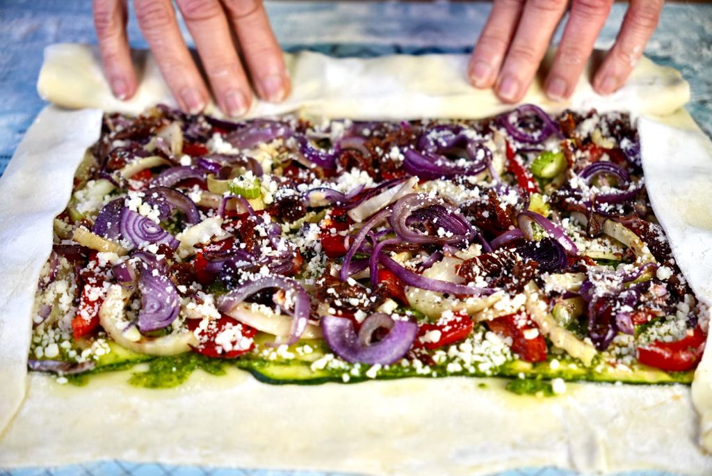 Vouw drie deegranden van de zijkanten naar binnen over de vulling heen. Begin met rollen vanaf de ingevouwen lange kant naar de open kant toe.