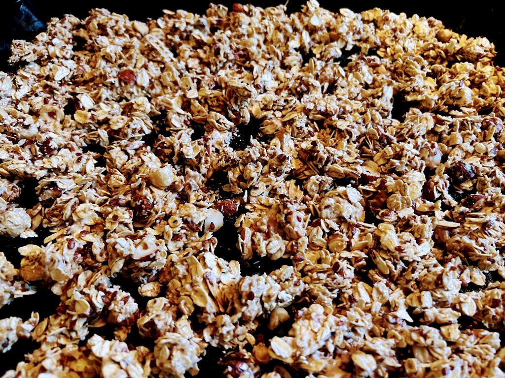 Schep de eiwitten voorzichtig door het granenmengsel en strijk gelijkmatig uit op de bakplaat met bakpapier. Schep de massa niet te vaak om, anders krijg je veel losse korrels. Het is lekker als je grotere brokken granola krijgt.