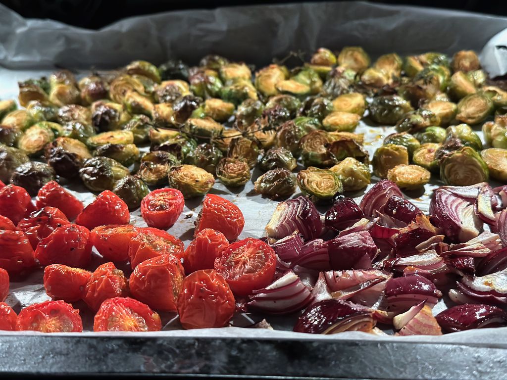 Hak de tomaatjes in twee helften als ze groot zijn. Besprenkel ze met een beetje olie, peper en zout. Hak de ui in grove stukken en doe er ook wat olie en peper en zout overheen. Goed door elkaar mixen. Vlei de spruitjes op de ovenplaat. Ernaast de tomaatjes en daarnaast de stukjes ui.