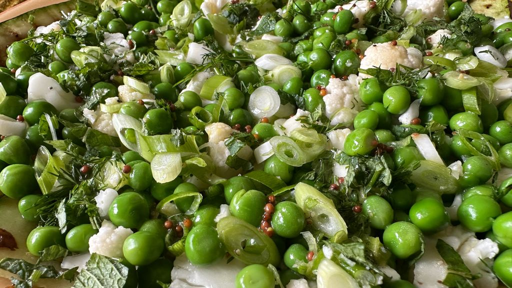 Blancheer de erwtjes 2 minuutjes in kokend water en giet ze door een zeef. Spoel af met koud water.