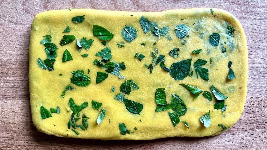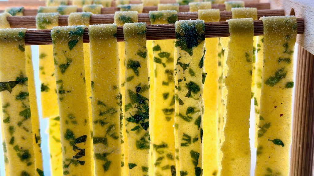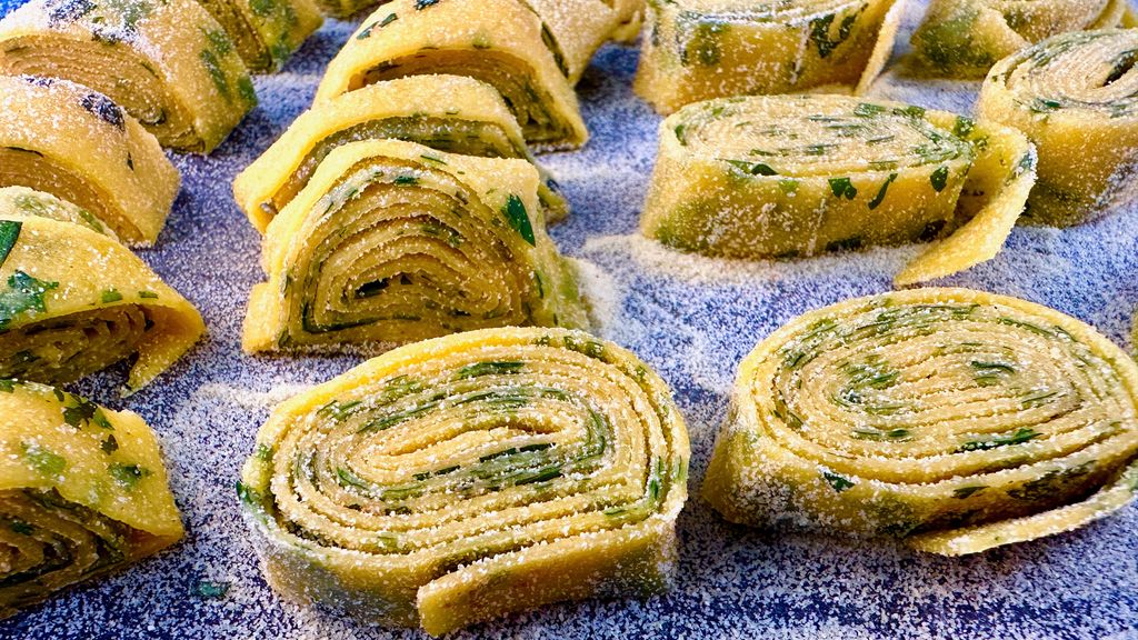 Als je alle deegstukken hebt uitgerold tot ongeveer 1 millimeter, kun je de bestoven deeglappen losjes oprollen en in reepjes van 2 cm breed snijden. Haal de rolletjes los en leg ze bijvoorbeeld op een met bloem bestoven theedoek of hang ze aan een pastarekje te drogen.