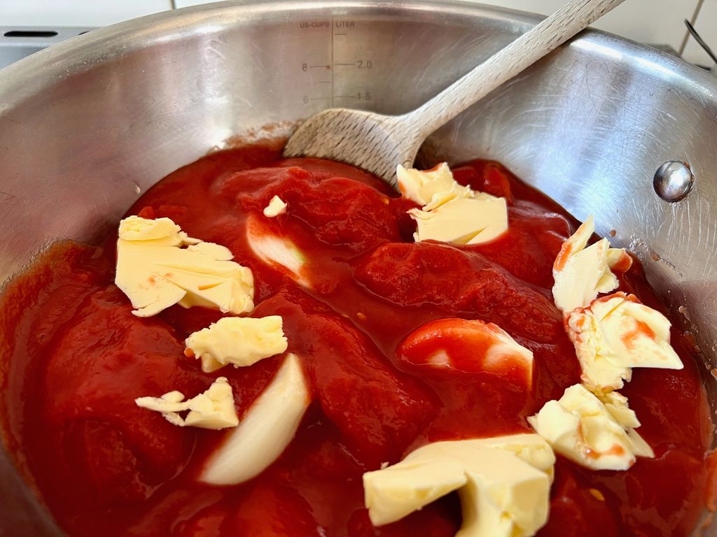 Pel de ui en snijd hem in de lengte doormidden. Doe de inhoud van twee blikken hele tomaten in een sudderpan en voeg de uihelften en de roomboter toe. Strooi er een flinke snuf zout overheen en breng dit aan de kook.