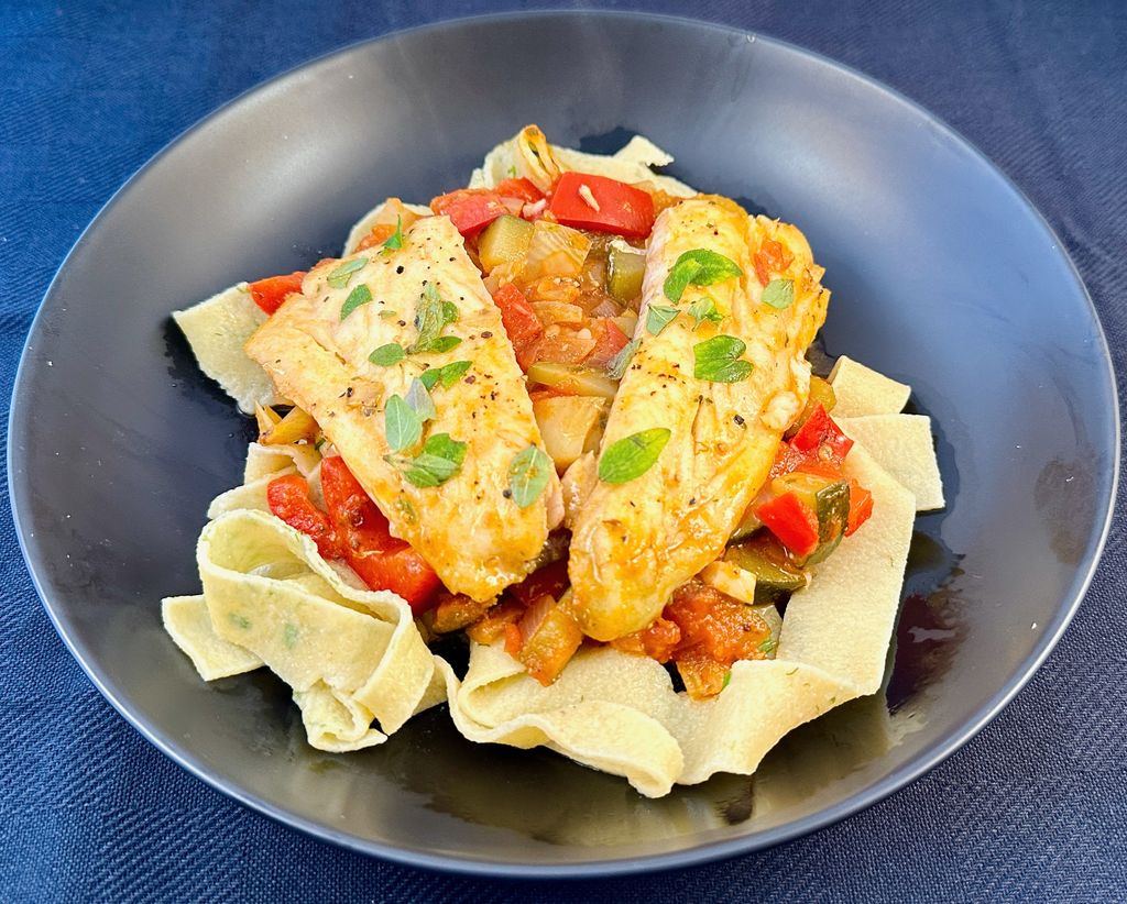 Voeg de tomatenblokjes toe en bak even op hoog vuur. Daarna doe je er de tomatenpuree bij en bak even mee. Voeg 100 ml heet water toe en doe de deksel op de pan en sudder nog een kwartier. In de laatste 10 minuutjes leg je de ingesmeerde visjes bovenop de ratatouille en pocheer ze zachtjes gaar. Als de vis niet meer doorzichtig oogt, is hij gaar. Of proef gewoon even.