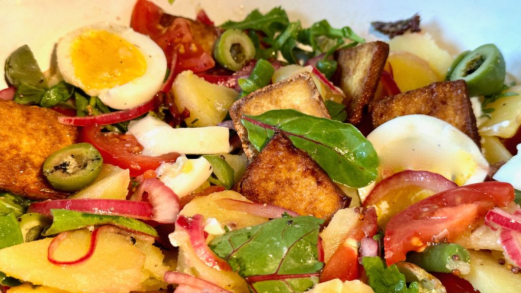Snijd de aardappel in kleine stukjes. Halveer de olijven. Snijd de tofu in hapklare plakjes.